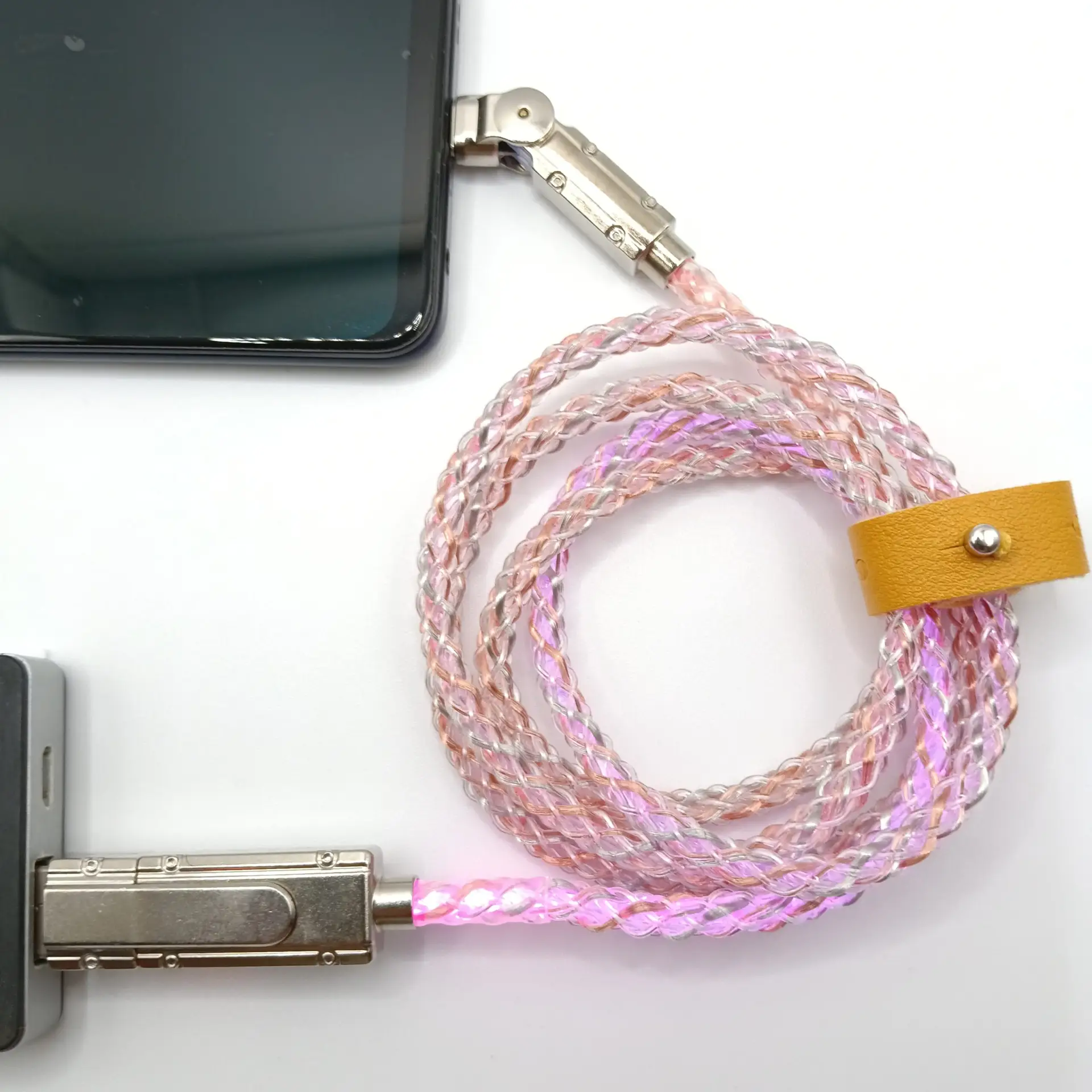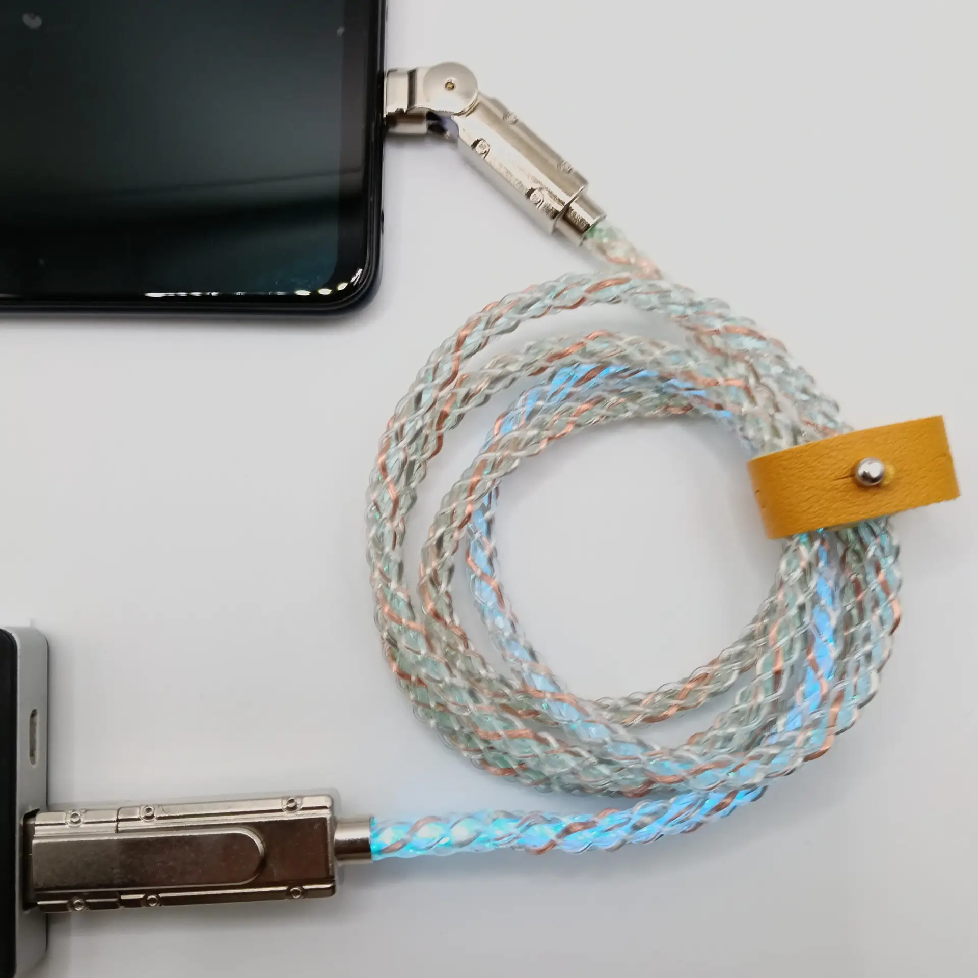 Elegante e dotato di un comodo nastrino di chiusura in finta pelle, il cavo svela il suo spirito nascosto collegandolo ad una presa USB. Improvvisamente inizia ad illuminarsi in vari colori che cambiano e si muovono nel tempo! Effetto wow assicurato al buio e certezza di trovare il cavo (e lo smartphone) anche se ci si sveglia al buio!