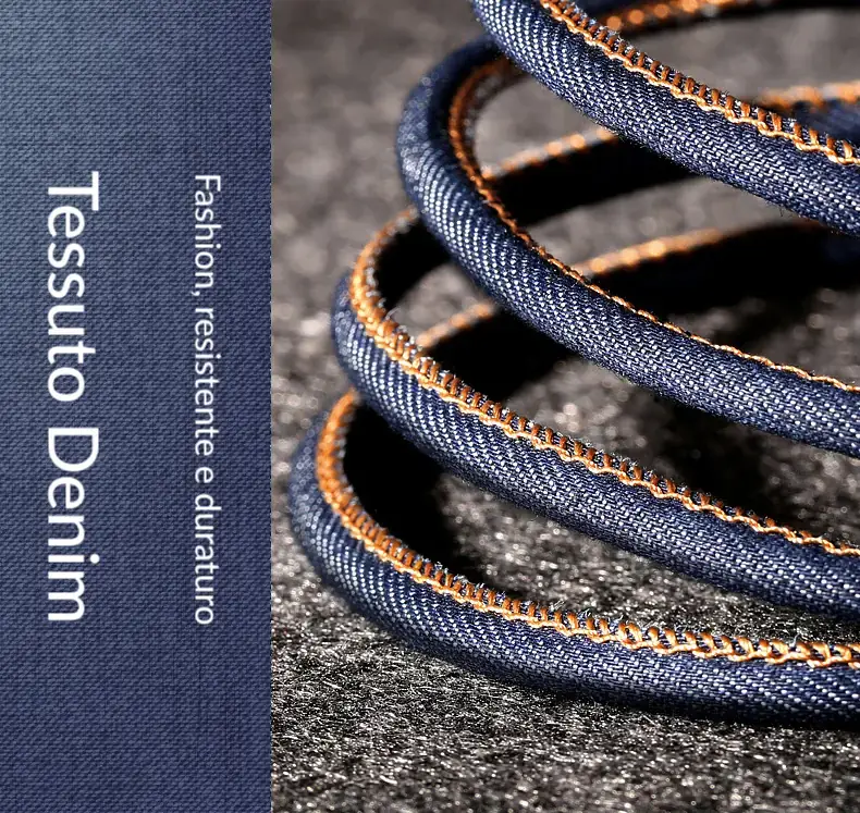 Rivestito in tessuto jeans blue denim, questo cavo unisce eleganza casual e resistenza estrema.